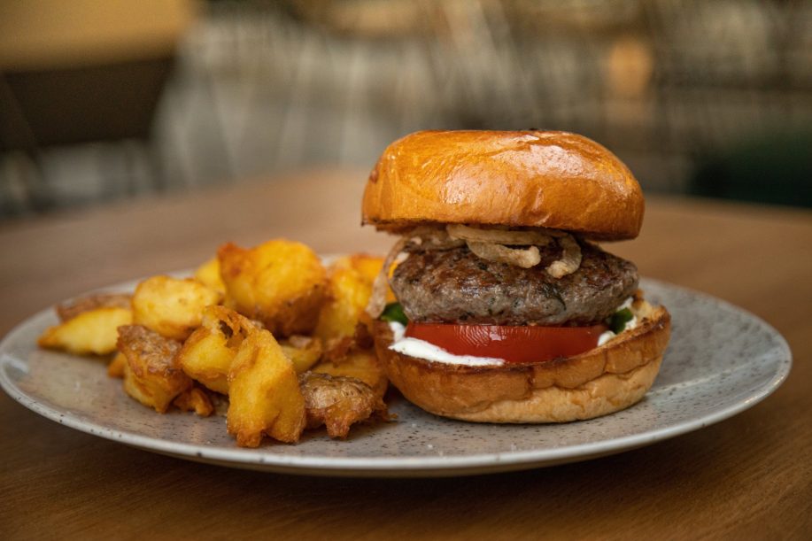 Στη συνέχεια παραγγείλαμε ένα απλό burger (το αντίθετο θα έλεγα), με ζουμερό μπιφτέκι από κρέας προβατίνας, mousse φέτας, crispy onion και όλο αυτό μέσα σε αφράτο brioche, συνοδέυομενο με πατάτες..