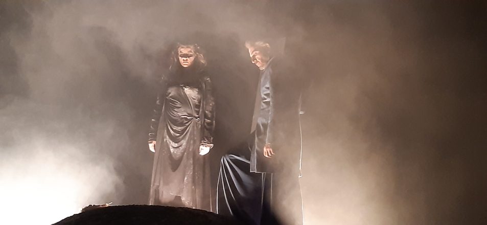 Από το ξεκίνημα κιόλας της παράστασης, όταν η τροφός (συντετριμμένη και εγκρατής στη σπαρακτική της παρουσία η Ελένη Καστάνη) και ο παιδαγωγός (όπως τον αποδίδει με ακαδημαϊκή τραγικότητα ο Θοδωρής Κατσαφάδος) συνομιλούν για τα δεινά της κυράς τους, η προσμονή για την εμφάνιση της Μήδειας κορυφώνεται ταχύτατα, με το βλέμμα μας να πέφτει διαρκώς στον κοίλο τύμβο που βγάζει καπνούς σαν από τα έγκατα της Γης, με την πρωταγωνίστρια ήδη παρούσα δια της απουσίας της, προτού καν ακουστεί η πρώτη της κραυγή.