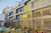 Η σκάλα στα αριστερά του ταμείου οδηγεί στην ταράτσα και σας βγάζει ακριβώς επάνω στη χτιστή οθόνη, που όπως είπα ήδη είναι παράγωνη και φωλιασμένη στους τοίχους των διπλανών κτιρίων. Σε τόνους του γαλάζιου και του γκρίζου, σε μεγάλο ύψος για άνετη θέαση και με ικανοποιητικό μέγεθος, δίνει το στίγμα του χώρου, ακριβώς απέναντι από την καμπίνα προβολής, ένα ημικυλινδρικό χτίσμα, διακοσμημένο τα τελευταία χρόνια με μια υπέροχη ζωγραφιά που μοιάζει (στα μάτια μου) να βγήκε από παλιό αναγνωστικό του δημοτικού. Οι μπλε πολυθρόνες είναι τοποθετημένες σε τρία μπλοκ, με δύο κάθετους διαδρόμους ανάμεσά τους, και μολονότι είναι παλιού τύπου με τις πλαστικές λωρίδες, είναι πολύ άνετες και ευρύχωρα τοποθετημένες, ενώ υπάρχουν και πολλά τραπεζάκια.