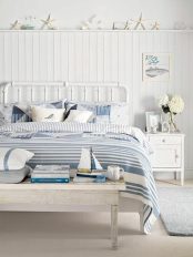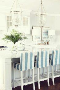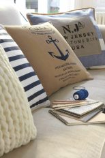 Οι χαρακτηριστικές ρίγες δε μπορούν φυσικά να λείπουν και μαζί τους αποχρώσεις του μπλε, από τυρκουάζ και γαλάζιο διανθισμένες με ναυτικά σύμβολα σε πίνακες, ναυτικούς κόμπους σε διακοσμητικά και μαξιλάρια στον καναπέ.