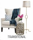 To transitional συνδυάζει τη ζεστασιά και την άνεση που αποπνέει το πρώτο, με τις καθαρές, κλασσικές γραμμές του σύγχρονου στυλ. Αντιπροσωπεύει θηλυκό και αρσενικό στοιχείο μαζί,απαλός φωτισμός και φιλόξενες φόρμες, σε αντίθεση με τραπέζι βιομηχανικού σχεδιασμού σε πιο αιχμηρό στυλ,κρατώντας όμως συνολικά,την ισορροπία.