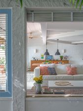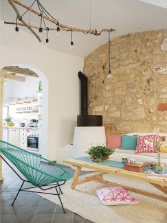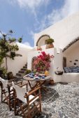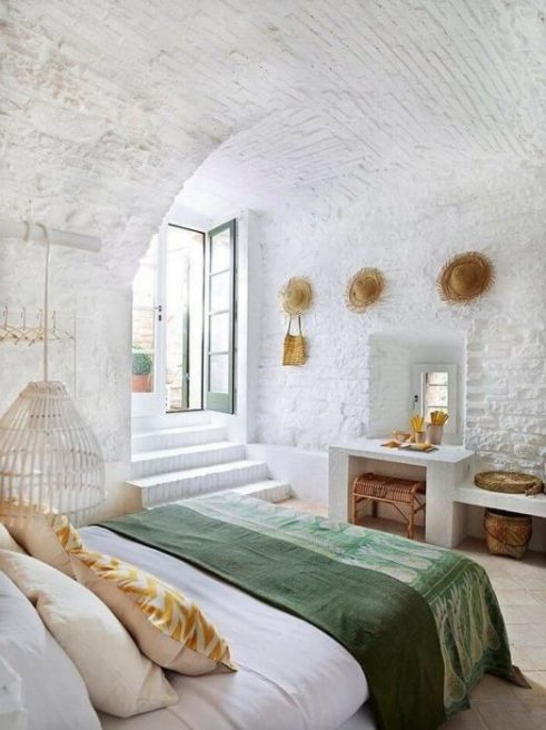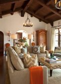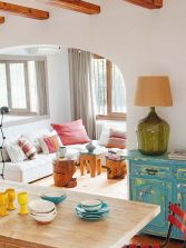 Τα πατώματα είναι επενδεδυμένα με τερακότα ή πέτρινες πλάκες, χρωματιστά μαξιλάρια με διάφορα έντονα print και κατά κύριο λόγο βαμβακερά στο πάτωμα, δημιουργώντας ένα ανεπιτήδευτο μεσογειακό στυλ και έπιπλα σε χαλαρές γραμμές και natural διάθεση.
