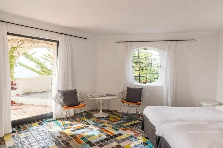Η κατοικία ενσωματώνεται στο περιβάλλον με τις οργανικές καμπύλες και τις φυσικές υφές του, ενώ ανοίγει προς τον κόλπο των Καννών.